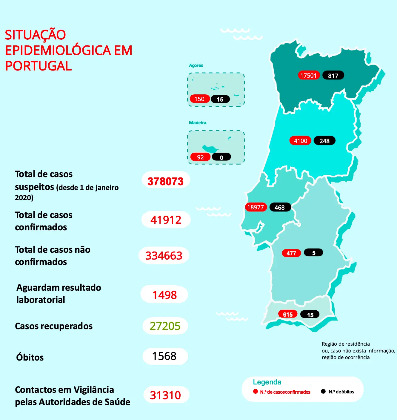 Números de portugal a subir: O coronavírus chegou a portugal: Novos casos (últimos 60 dias). 6 994 novos casos, 69 mortos e 4 222 recuperados em portugal. A região do algarve tem hoje notificados 348 novos casos, somando 9.184 infeções e 79 mortos.
